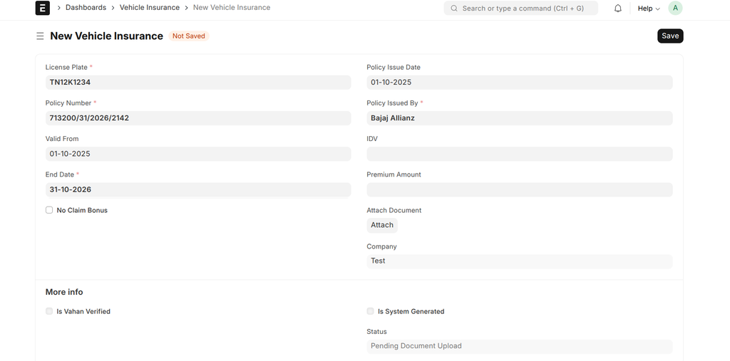 The Vehicle Insurance document is used to track individual insurance policies for each vehicle in your fleet. It includes features for validating policy details against the official Vahan service to ensure compliance and data accuracy.