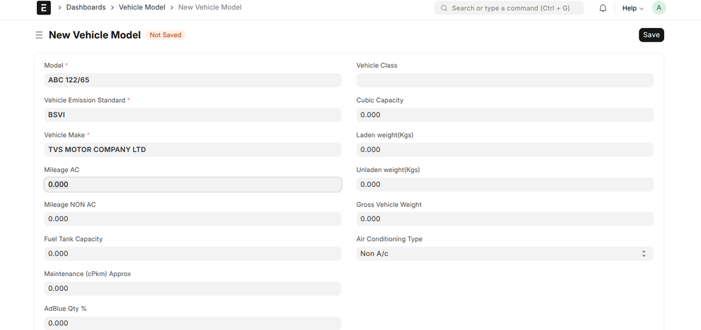 The Vehicle Model document is the central master where you define the specific technical and performance details for each vehicle model in your fleet.