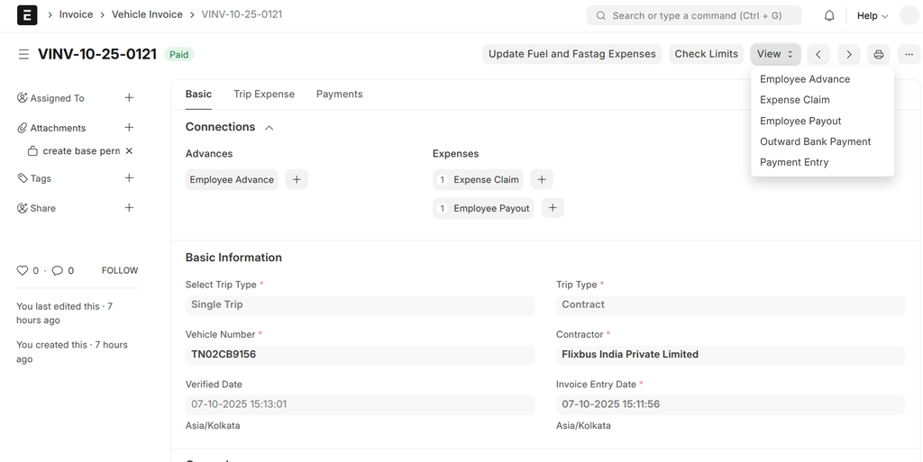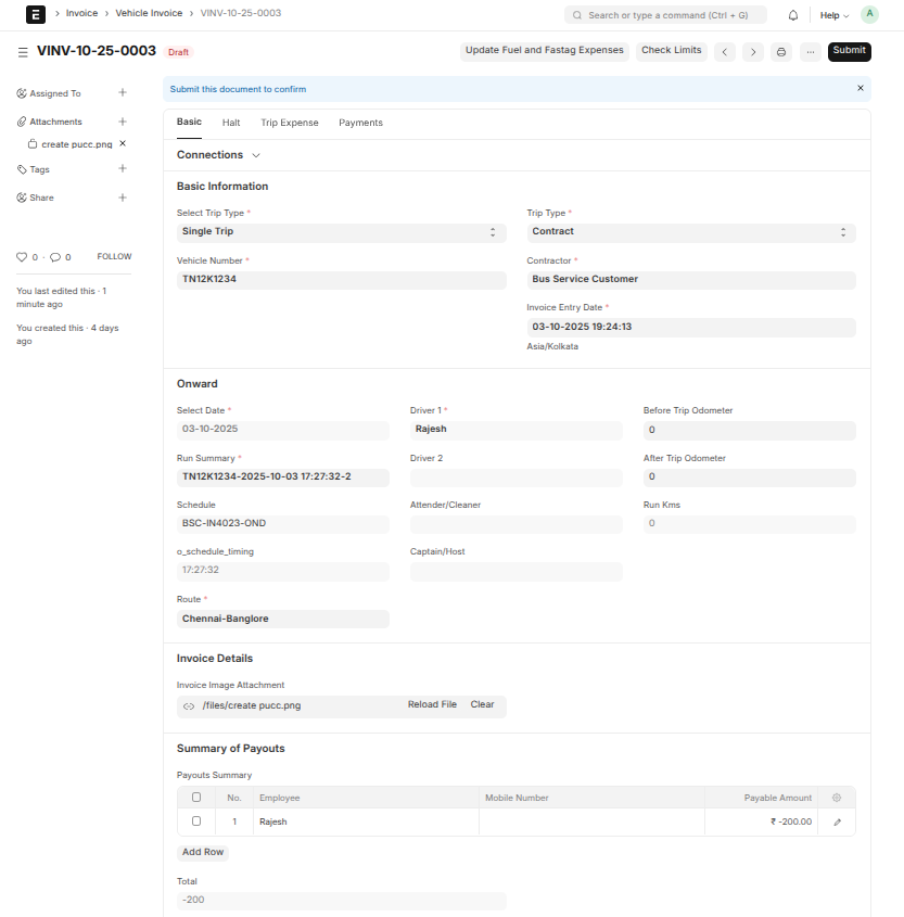 - Custom buttons such as Update Fuel and Fastag Expenses, Check Limits, and Create Employee Payout are dynamically displayed based on document status.