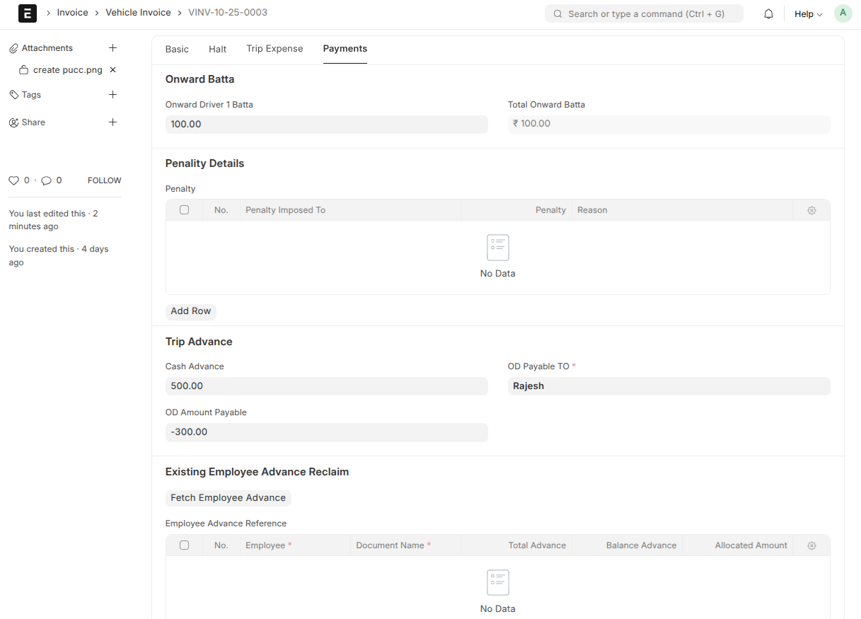 Once generated, the Vehicle Invoice includes multiple sections that summarize operational and financial data. Users can verify and update fields before submission.