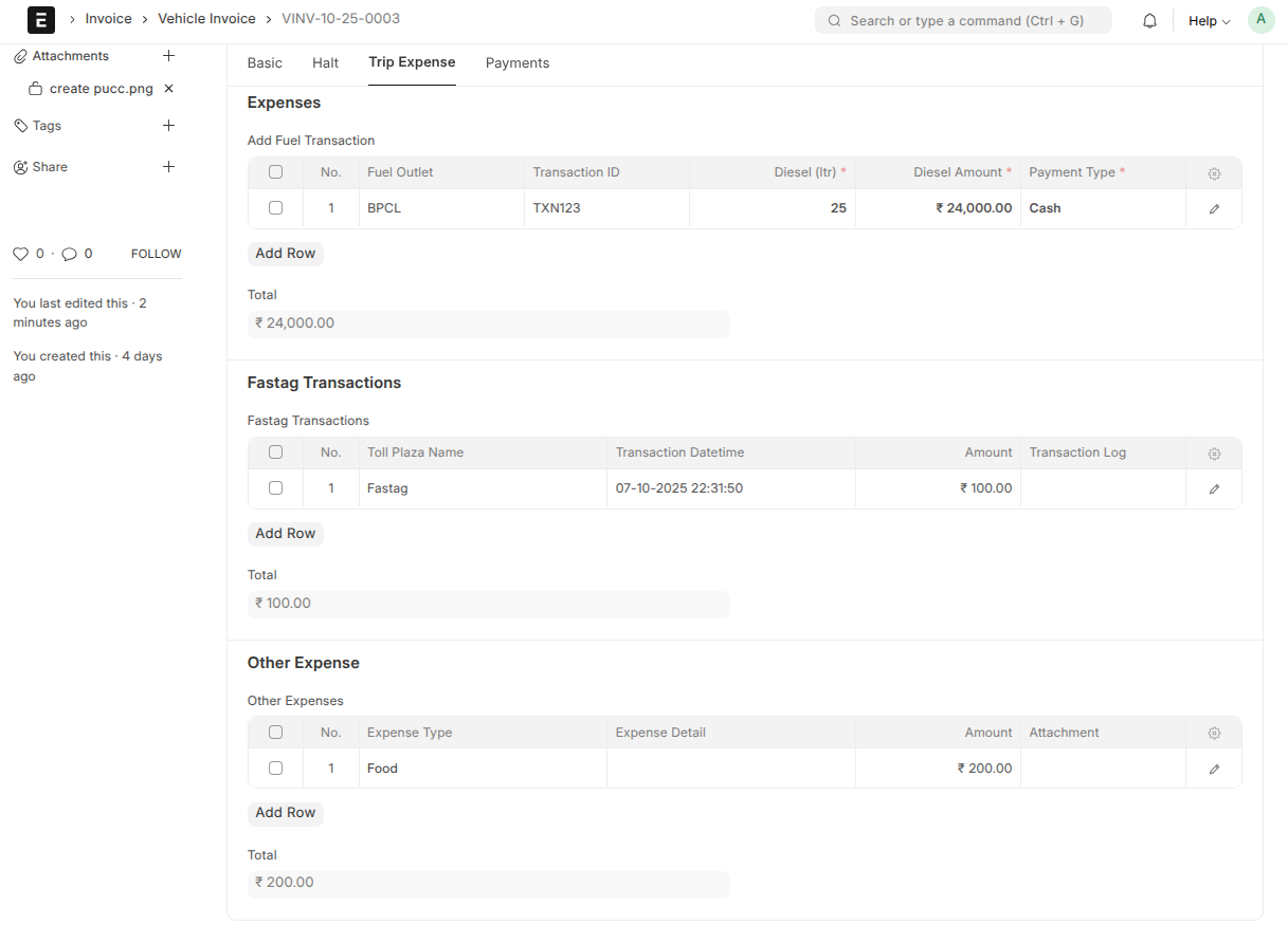 - Updates dependent tables such as Fuel, Fastag, and Crew Allowances.
